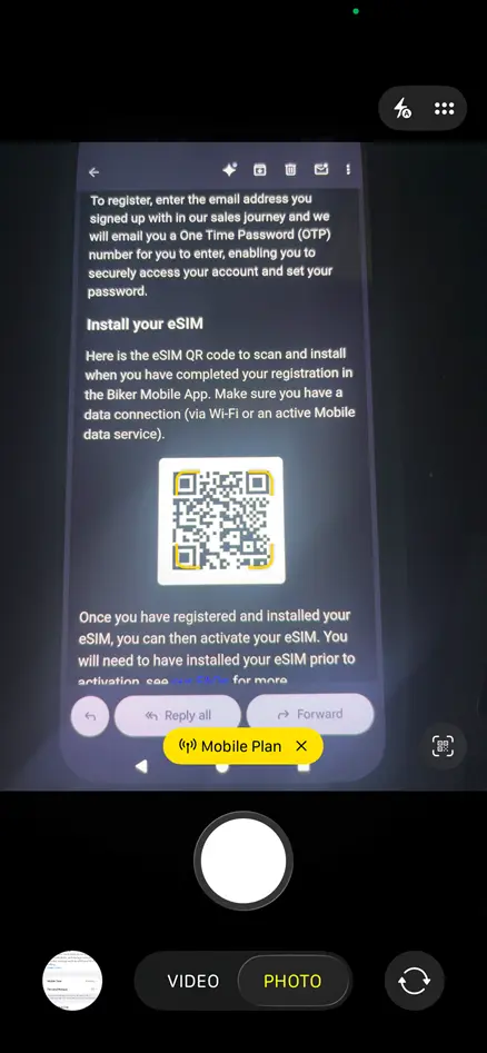 Point the phone camera at the QR code -in this case the welcome email on another device- and click the yellow ‘Mobile Plan’ button