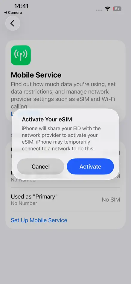 This opens the phone Mobile Service settings screen with a popup asking if you want to Activate your eSIM . Click ‘Activate’