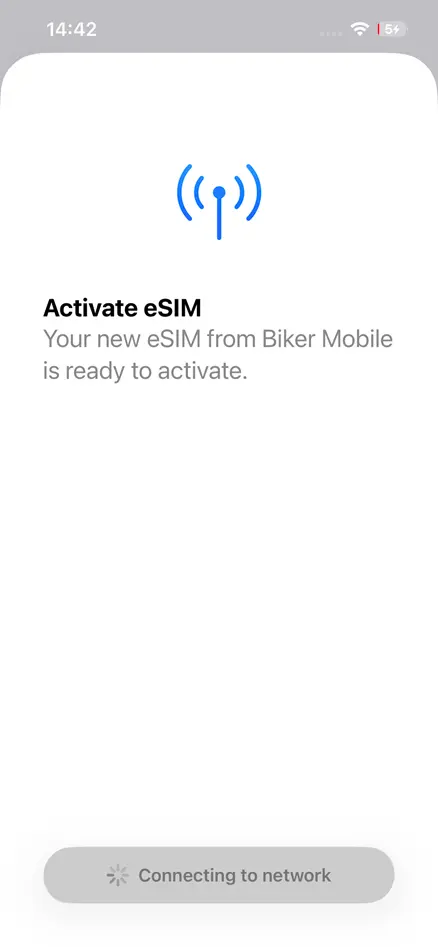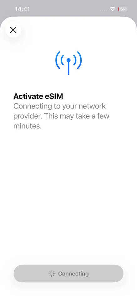 The screen refreshes displaying ‘Connecting to your network provider. This may take a few minutes.’ with grey ‘Connecting’ lozenge at the bottom of the screen