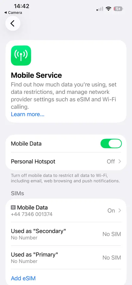 You are then taken to Mobile Service settings, now with an added entry for the new eSIM under ‘SIMs’