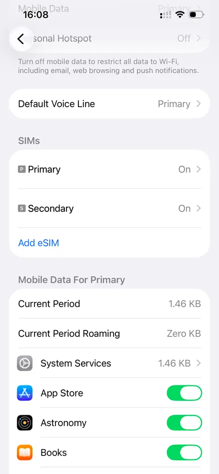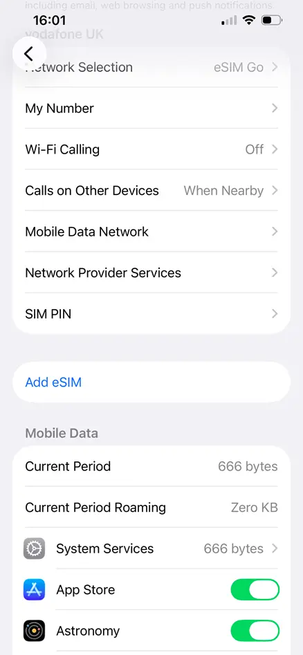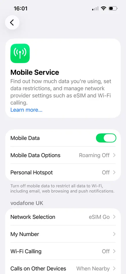 Your device will now display the Mobile Service Settings, now with an additional entry for the Biker Mobile eSIM under ‘SIMs’