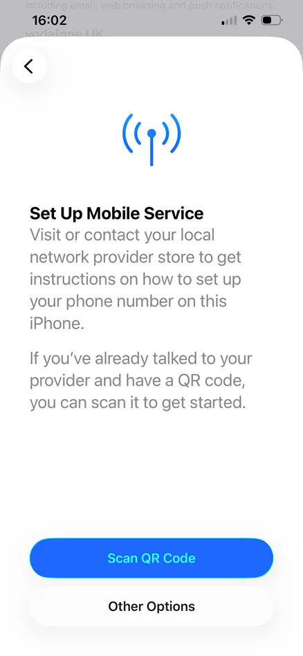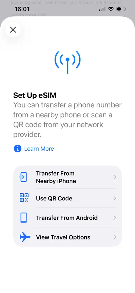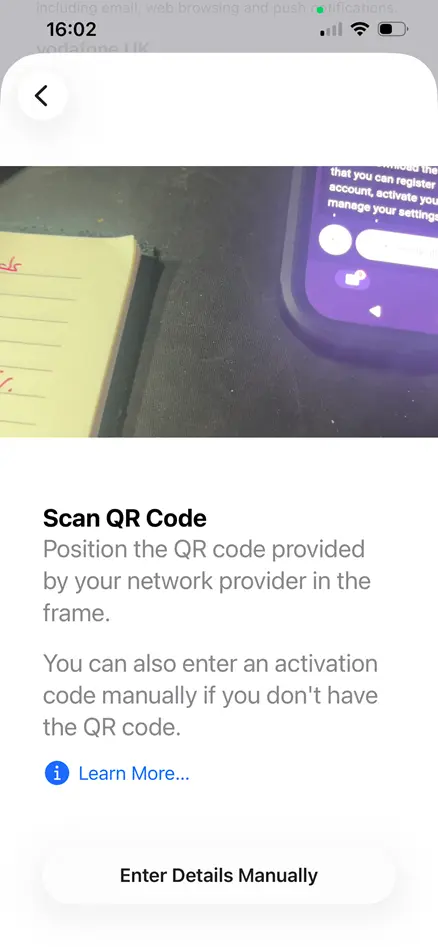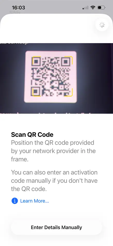 Do not select ‘Enter Details Manually’. These require you to enter Activation Code, SM-DP+ address, and Confirmation Code, which you do not have available with your eSIM.