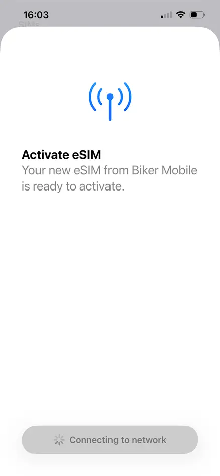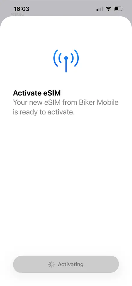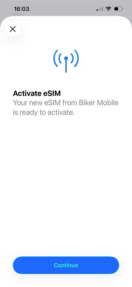 When you have successfully scanned the QR Code the screen will refresh, presenting an Activate eSIM Screen. Your eSIM from Biker Mobile is ready to activate. Press the blue ‘Continue’ button