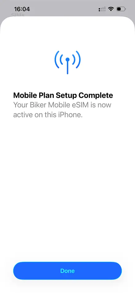 Once connected to the network the screen will refresh, displaying Mobile Plan Setup Complete. Your Biker Mobile eSIM is now active on this iPhone. Click ‘Done’
