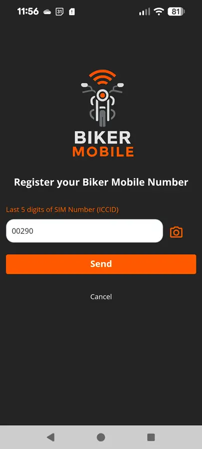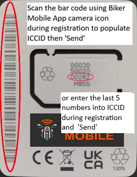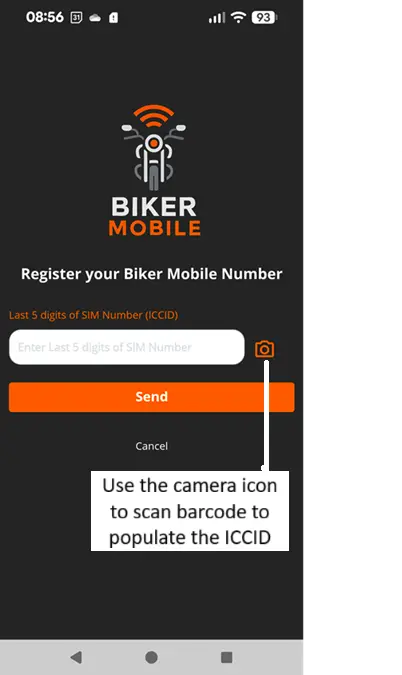 To enter the SIM number (ICCID) you can scan the SIM Barcode using the Biker Mobile app camera icon: